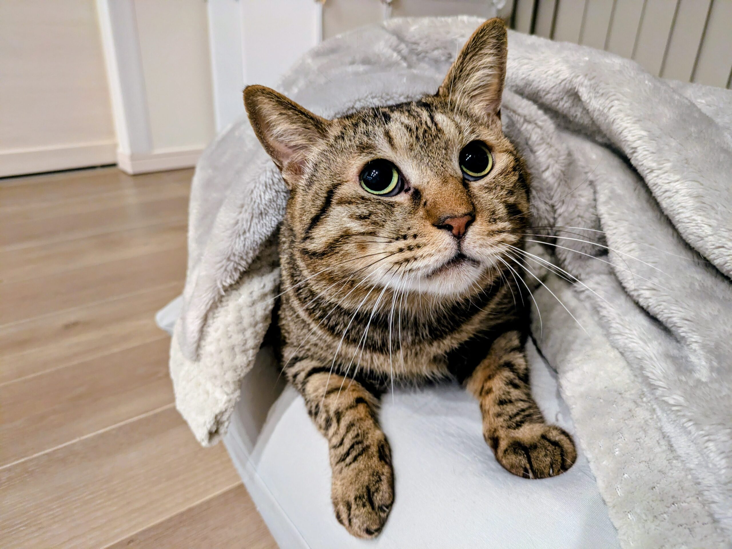 | 性格・特徴 | 太めですが血液検査も問題なく健康状態良好です タレ目で甘ったれた顔をしています 可愛い寝顔と、白っぽい猫についていく姿がかわいいです キジトラ模様がはっきり出ていて魅力的です。胸にはハートの毛流れがあります 丸いフォルムでムチムチしています 基本大人しく鳴きません。あまり近づくとシャーと挨拶します 人は苦手ですがおやつ時はゲンキンです 見た目は大きく怖そうに見えるかもしれませんが猫に優しく、残念ながら子分気質です。猫社会では弱い立場です 主張はなくひっそりとしています 好き嫌いはなく薬もおやつに混ぜると騙されます。簡単です おやつは手から食べれますので触らずともスキンシップができます オモチャ遊びはスローでみんなに負けます トイレは散らかさず控えめに砂をかきます 風邪をひきやすく薬の反応は良いです 臆病で猫がいないと駄目なタイプです。ベストはねこ活の猫と一緒がオススメですが先住猫がオスの白っぽい猫であったりであると喜びます。メス猫には興味がありません |