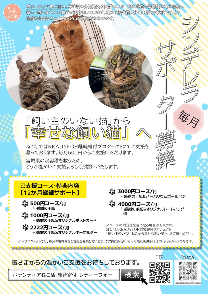 クラウドファンディング「READY FOR」で、ねこ活に継続支援をしてくださる「シンデレラサポーター」を募集しています!